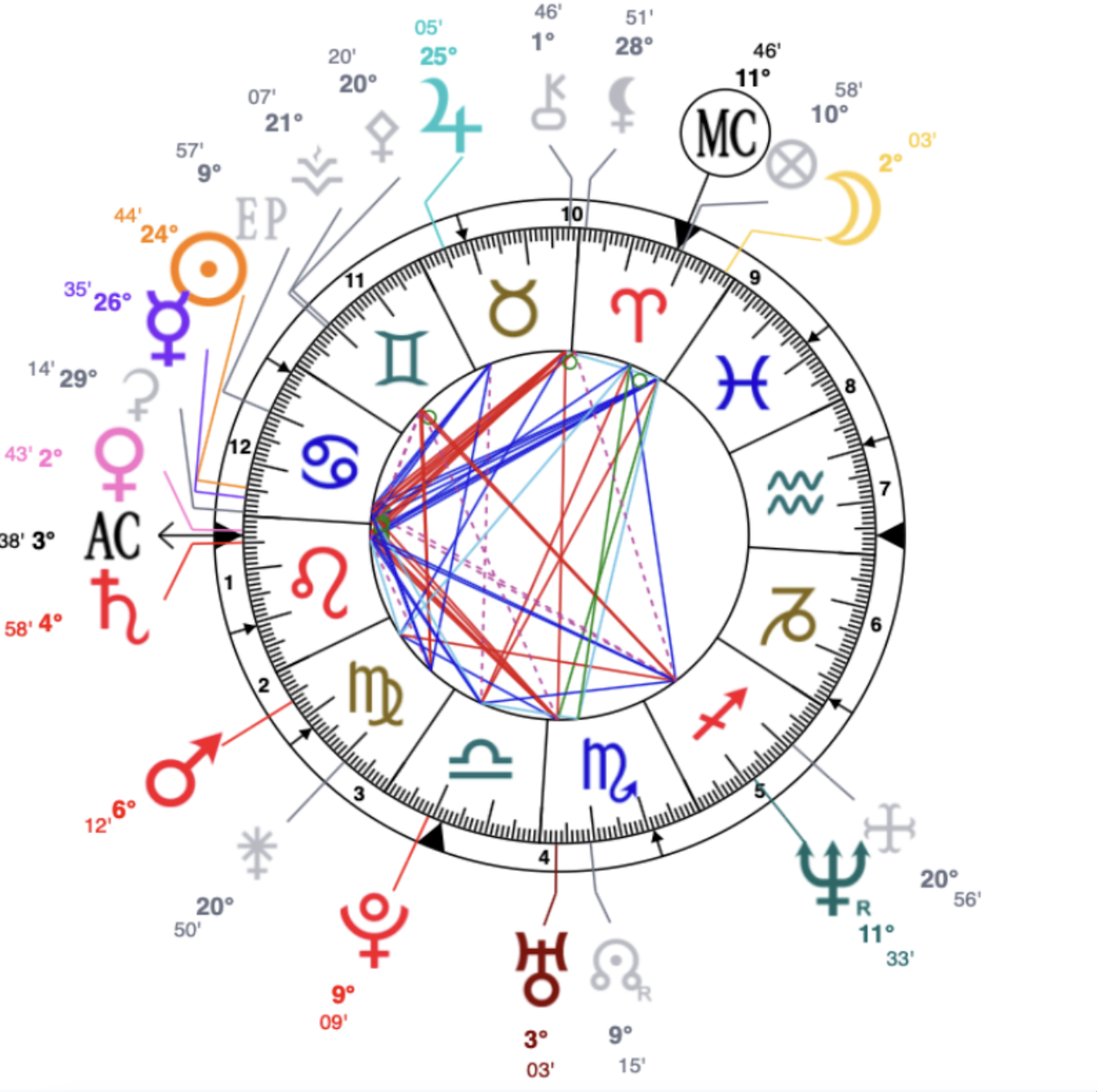 Les aspects sont les relations qui existent entre les personnes ou les fonctions. Ils nous indiquent comment interagissent les planètes entre elles. Les aspects peuvent faciliter les relations entre les planètes ou les rendre plus compliquées. Ce sont lignes colorées (bleues, rouges et vertes) tout au centre du cercle. Les principaux aspects sont: la conjonction, l'opposition, le carré, le sextile, le trigone, le quinconce.