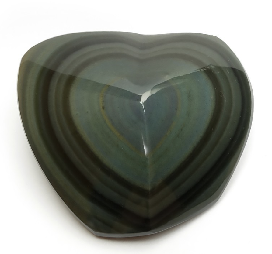 Regardez cette lumière tranchante qui éclate au milieu de cette montagne en forme de Coeur. On monte au sommet en étapes, dans une alternance de paliers gris clairs et gris foncés, avant d'arriver à un coeur bleu bien plus tendre. Mettez ce coeur au soleil et vous obtiendrez peut-êtres des reflets rose et violet d'une beauté touchante. Mais avant cela, il se peut que vous rencontriez la noirceur. Il existe de nombreux types d'obsidiennes: les obsidiennes dorées, les obsidiennes argentées, les obsidiennes neige, les obsidiennes arc-en-ciel ou oeil céleste comme ci-dessus. Toutes n'ont pas ce dégradé de couleurs. Certaines sont simplement noires et elles sont tout autant porteuses de cet enseignement capital : l'ombre et la lumière sont les deux faces d'une même pièce et sans l'une, on ne pourrait pas voir l'autre. Nous avons tous et toutes ces deux faces en nous et l'obsidienne nous invite donc à regarder nos dualités intérieures, nos conflits, à chercher à les apprivoiser, à les équilibrer avec justesse, sans jugement. Elle nous aide à poser un regard lucide et neutre sur nous-mêmes et sur toute situation, à nous placer dans la lumière du Coeur, pour éviter de tomber dans les pièges de la précipitation, des jugements hâtifs et des filtres de nos blessures et de nos rancoeurs.