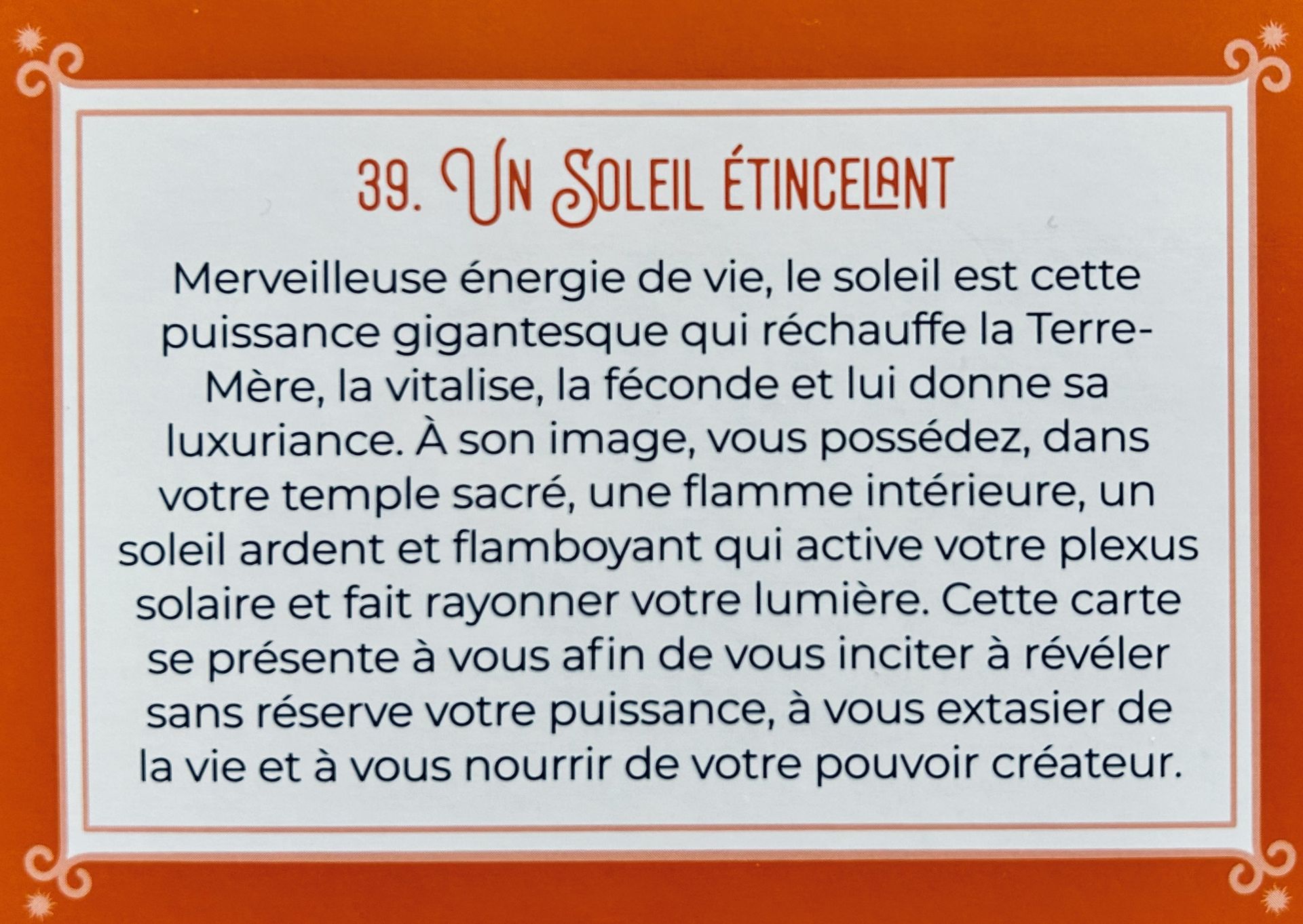 Je ne tiens plus. Je ferme les yeux un instant. Je me connecte à ma guidance intérieure et je tire une carte. Wouaw ! Je rêve ou la 39e carte est en synchronisation totale avec le thème du magazine.