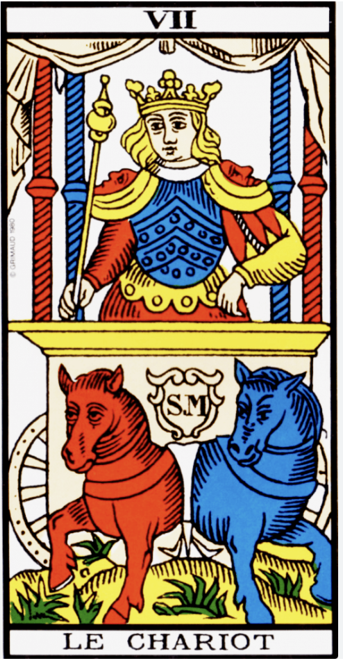 Quelle est l'essence de l'arcane? Un jeune homme est installé sur un char, tiré par deux chevaux ou deux sphinx selon les versions du Tarot. Il rappelle la figure de l’insouciant Bateleur et de la première arcane par sa tranquillité. Notre jeune homme a toutefois gagné en maturité au travers des différentes épreuves et enseignements des six première arcanes. Il est couronné, signe qu’il a réussi à atteindre un but. Il semble également avoir maîtrisé les antagonismes et les forces contraires extérieures (les chevaux ou sphinx de couleurs différentes et allant dans des directions opposées). Ces antagonismes extérieurs renvoient à nos conflits intérieurs. Les roues du char ne semblent pas répondre aux lois de la physique mais le jeune homme reste serein et aux commandes. Il se sait protégé, confiant qu’il est à l'image du divin, qu'il a le divin en lui et avec lui.
