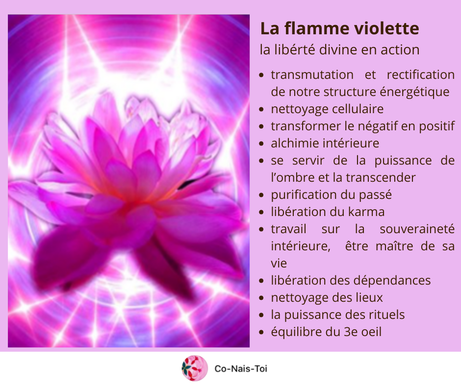 - Intention : Vous pouvez poser l'intention de vous libérer d'une mémoire en particulier et imaginer que cette mémoire ce consume dans le feu vibrant de la flamme violette.